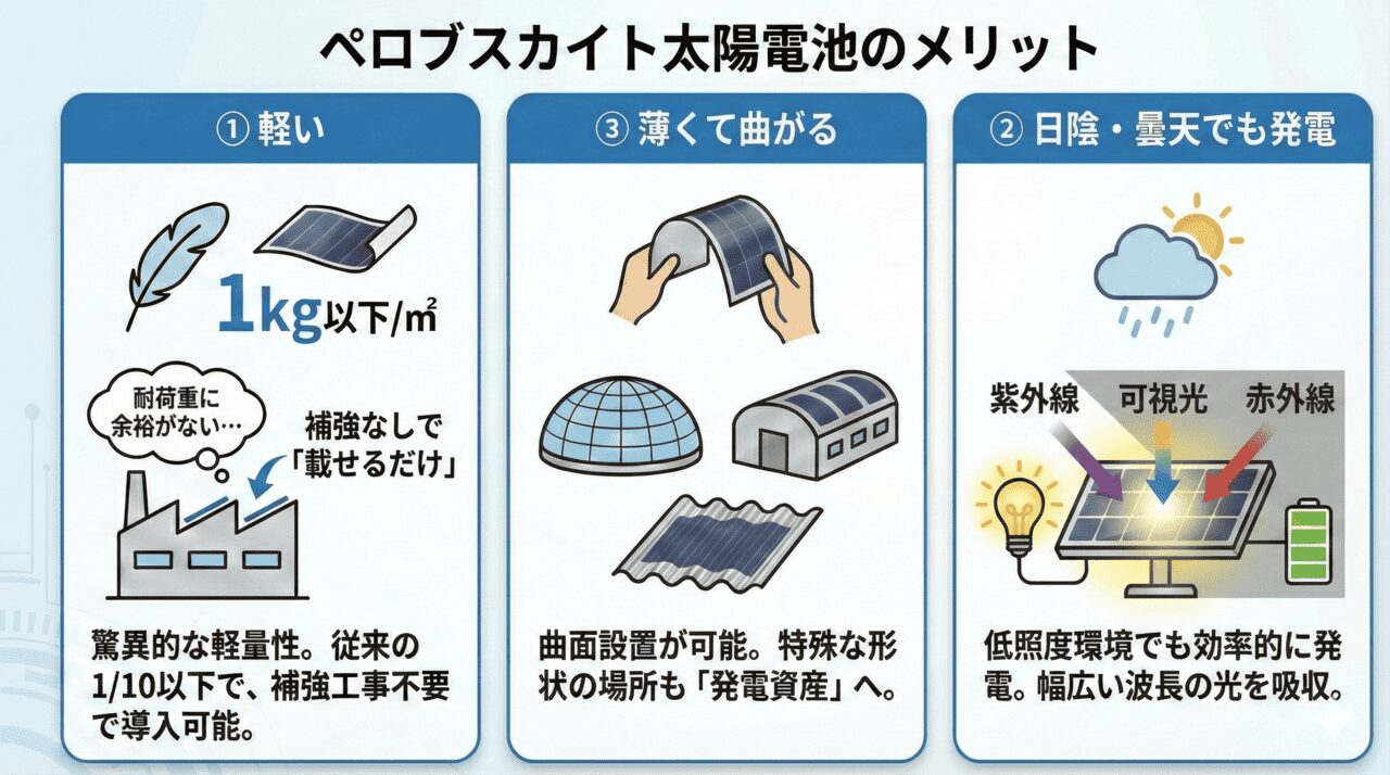 従来型のシリコン系太陽電池と比べ、ペロブスカイト太陽電池はどのような優位性があるのでしょうか? 導入の課題となっていた「耐荷重」と「施工性」の観点も踏まえ、3つのポイントから説明します。