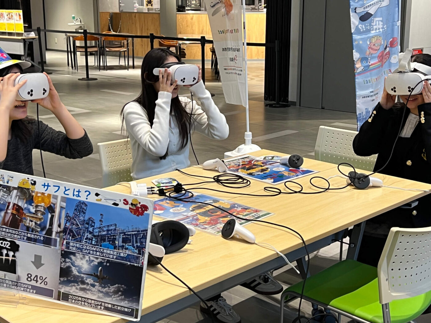 また「Fry to Fly Project 」イベント内にて、SAFができるまでの様子をVRで体験できる映像体験会なども行われており、持ち込んだ廃食用油がSAFになる意義を一般の方にも感じていただけるコンテンツとなっています。